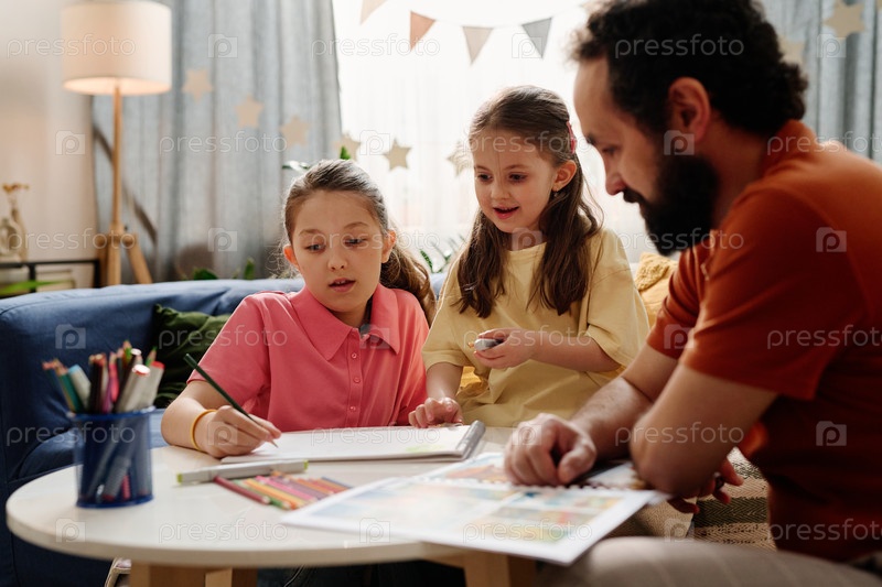 Учитель следит за тем, как две девочки делают домашнее задание дома