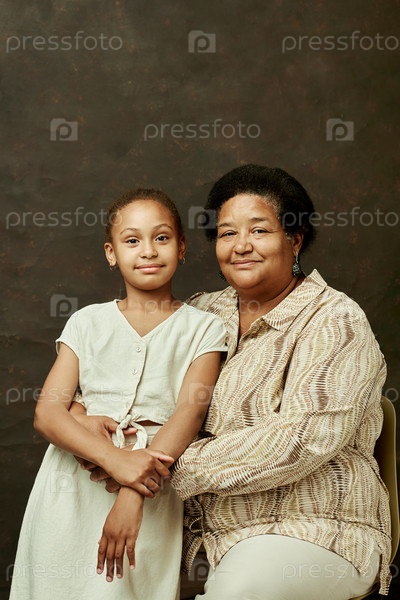Черная бабушка обнимает внучку на коричневом фоне