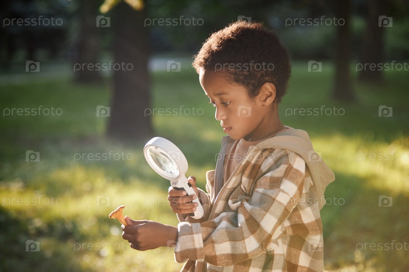 Маленький мальчик собирает грибы в лесу