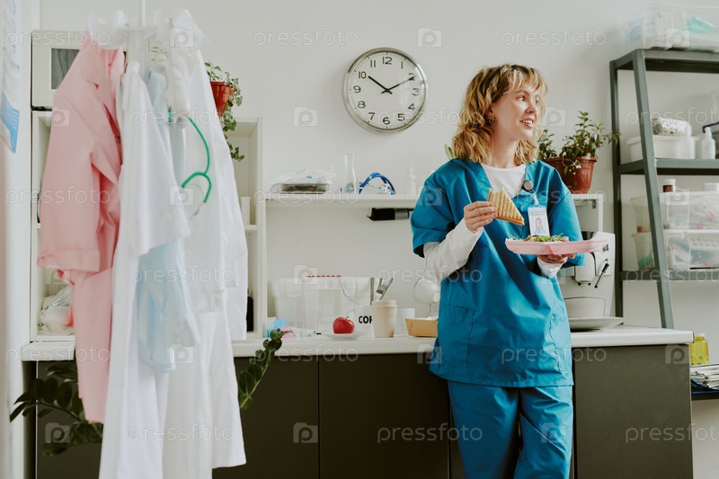 Молодой доктор, кусающий бутерброд