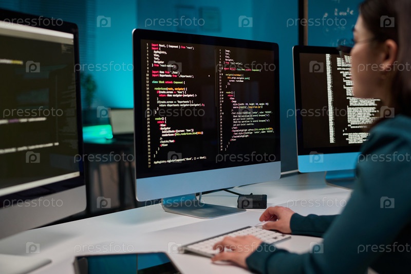 Компьютер с линиями кода на экране и девушкой, печатающей