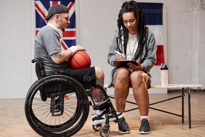 Улыбающийся спортсмен с помощью инвалидной коляски