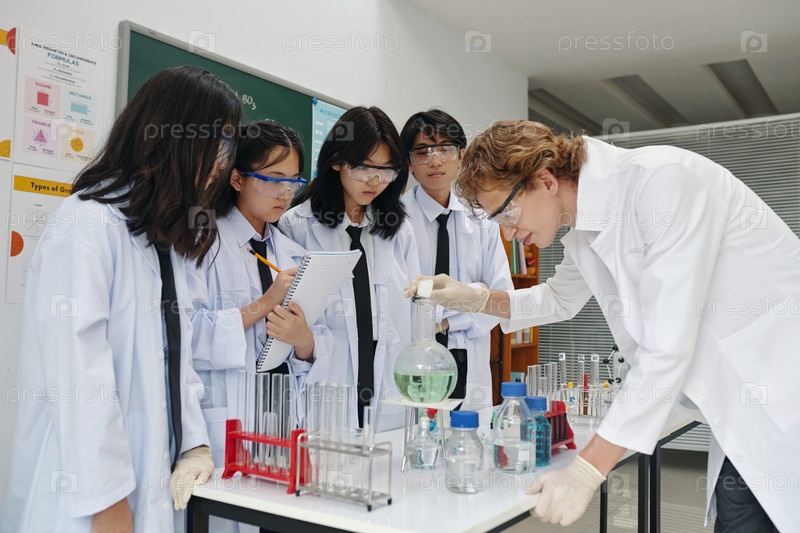 Учитель проводит химический эксперимент со студентами