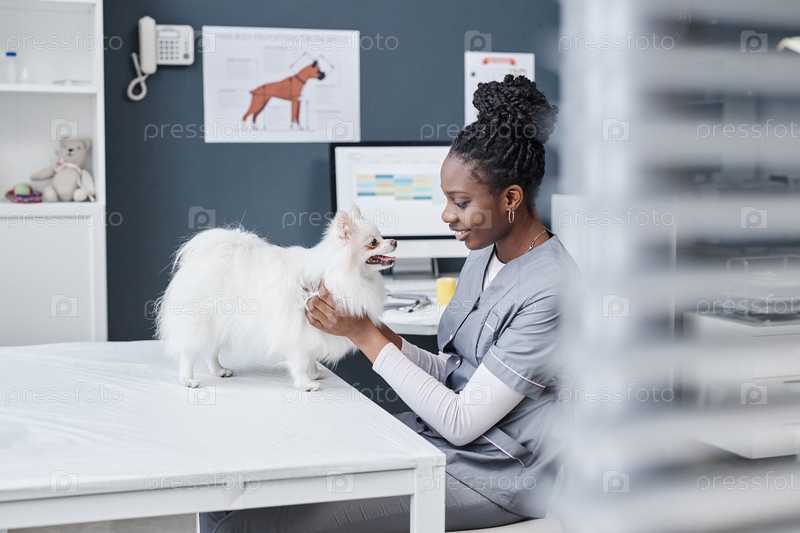 Внимательный врач и собака-помераньян во время медицинского осмотра