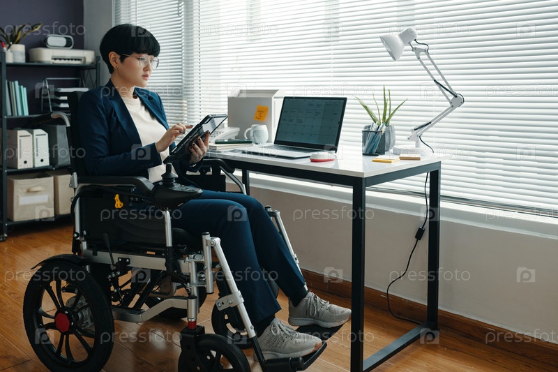 Офисный работник с инвалидностью, работающий на планшетном ПК