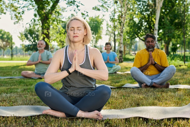 Спокойный инструктор по йоге с закрытыми глазами