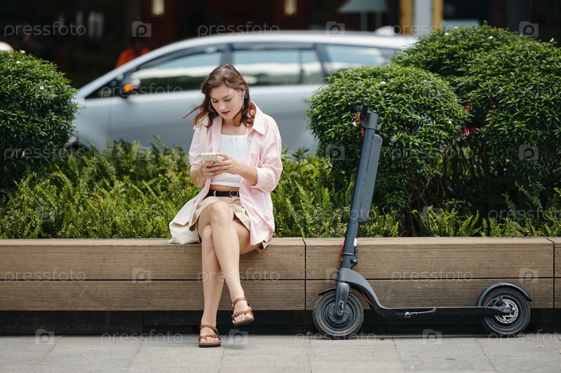 Молодая женщина, сидящая на скамейке и отправляющая сообщения по смартфону летом