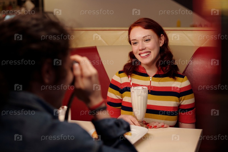 Женщина, улыбающаяся во время ресторана Meetup Woman Holding Milkshake