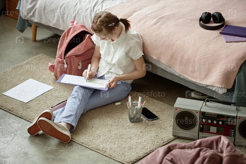 Молодая девушка сидит на полу, рисует художественные работы карандашом