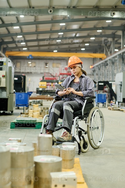 Промышленный работник в инвалидном кресле, выполняющий инспекцию качества