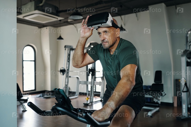 Мужчина тренируется на тренажерном велосипеде с очками VR