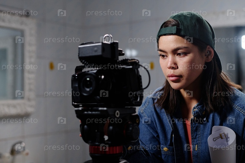 Портрет молодой женщины, снимающей с профессиональной камеры