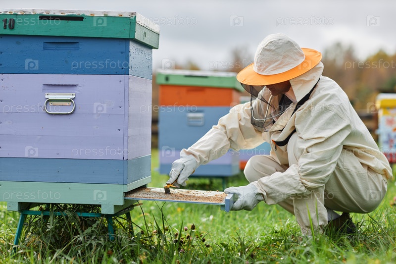 Апиарщик в костюме Уборка улья Скребление грязи на ферме Apiary A