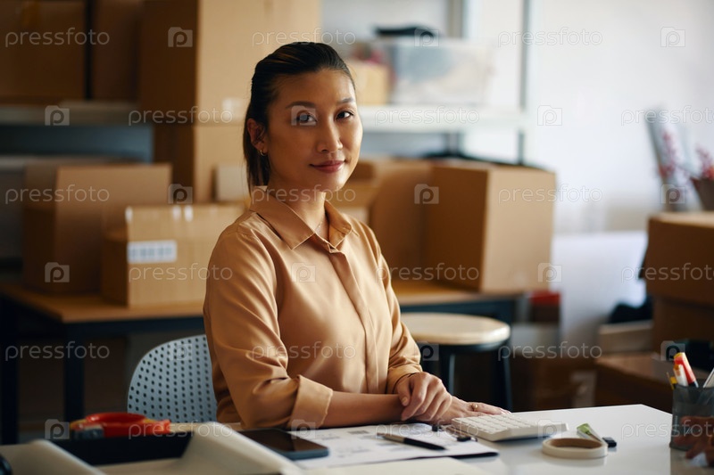 Работница склада сидит на своем рабочем месте