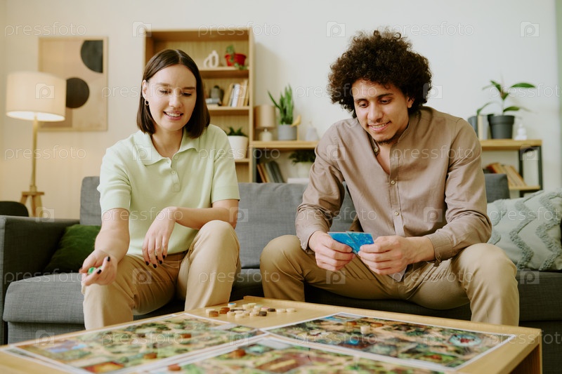 Счастливая молодая пара играет в настольную игру