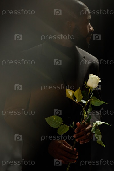 Снято с призрачным свечением черного человека, держащего белую розу на чёрном в студии
