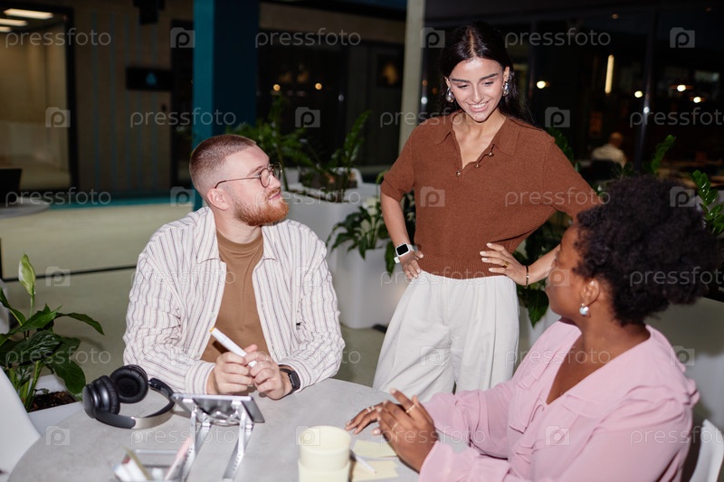 Разнообразная команда из трех человек, участвующих в деловых встречах, сидящих за столом кафе в офисном центре