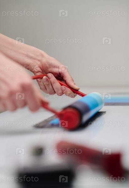 Руки, движущиеся на ролике вдоль рабочего стола