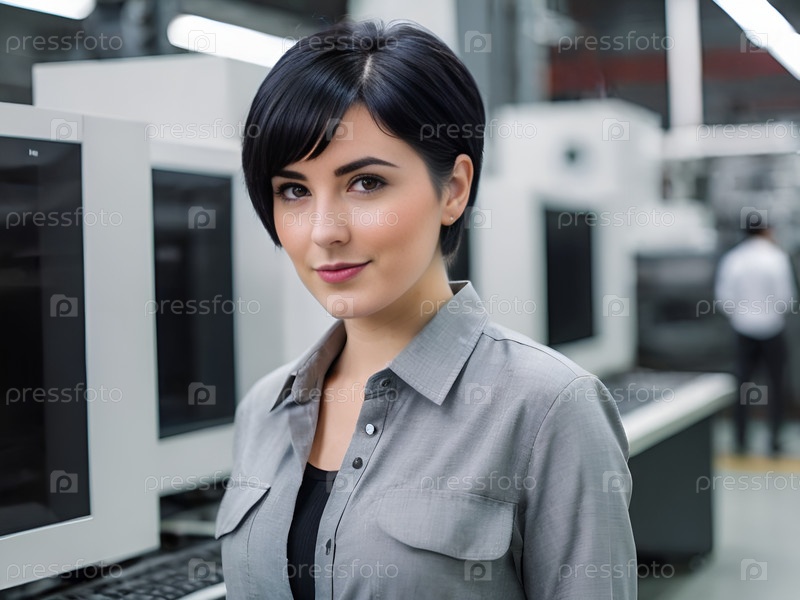 Портрет улыбающейся женщины в индустриальной офисной обстановке
