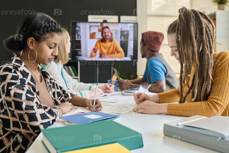 Мультиэтническая группа студентов в видеозвонке с учителем