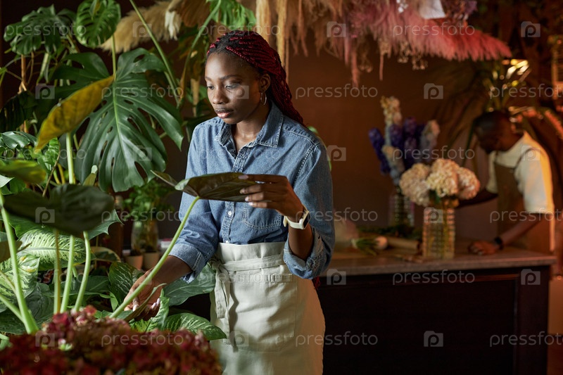 Молодая чернокожая женщина инспектирует растения в магазине