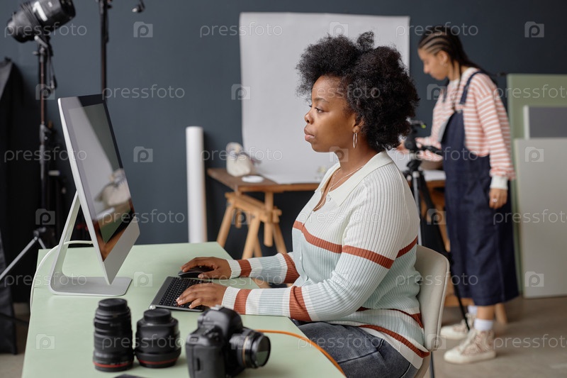 Женщина-фотограф, использующая компьютер