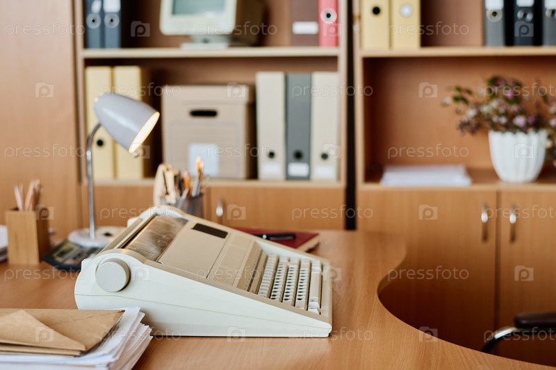 Винтажная конфигурация офиса с пишущей машиной и настольной лампой
