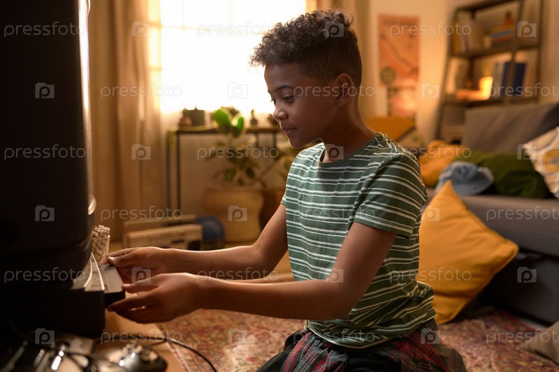 Подросток вставляет VHS-кассету в видеорегистратор в ретро гостиной