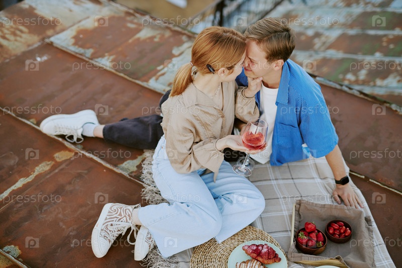 Наслаждаясь пикником на крыше с романтической атмосферой при закате солнца