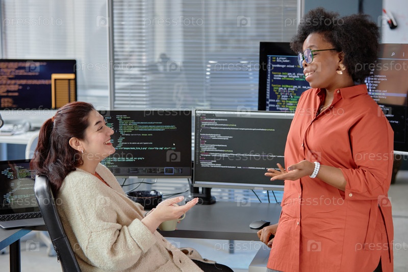 Позитивная женщина плюс размер ИТ-инженеры разговаривают