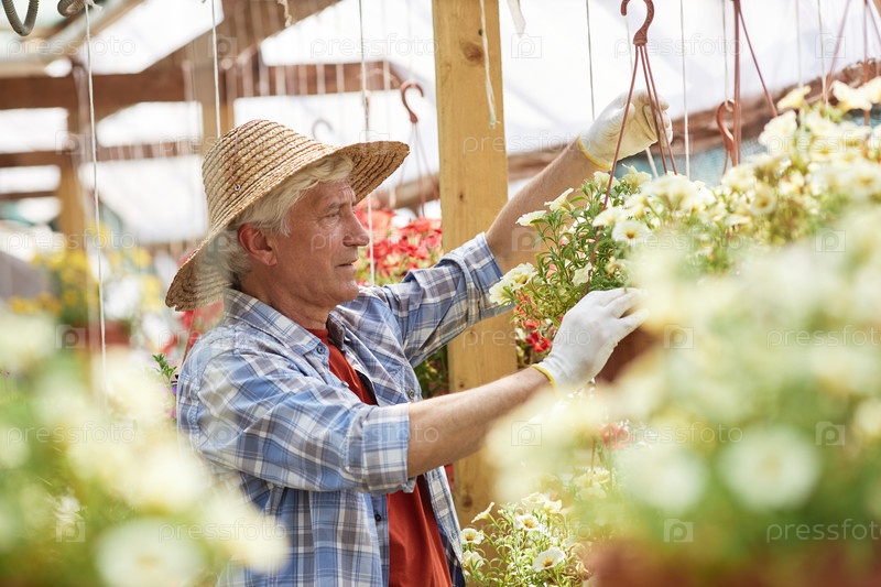 Улыбающийся фермер устраивает висящие цветочные горшки в теплице