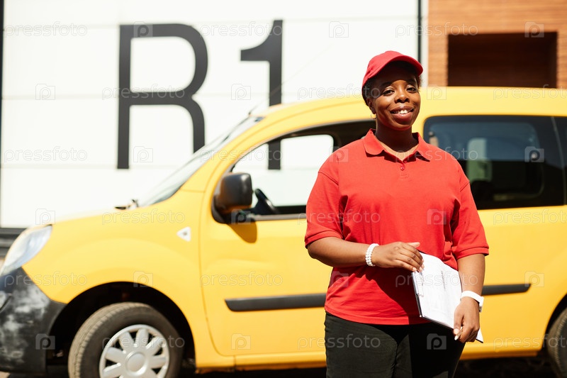 Улыбающийся доставщик, стоящий рядом с транспортным средством со щитом