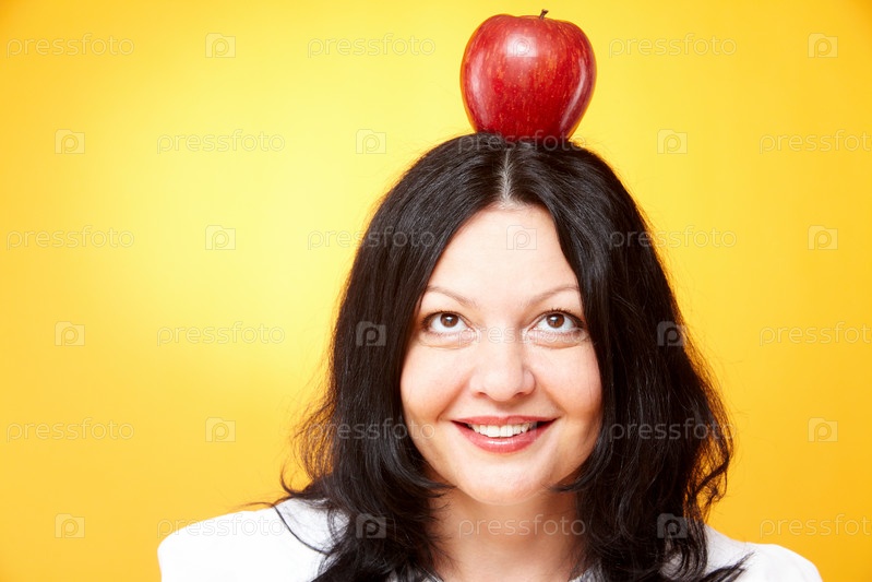 Женщина с яблоком на голове на желтом фоне