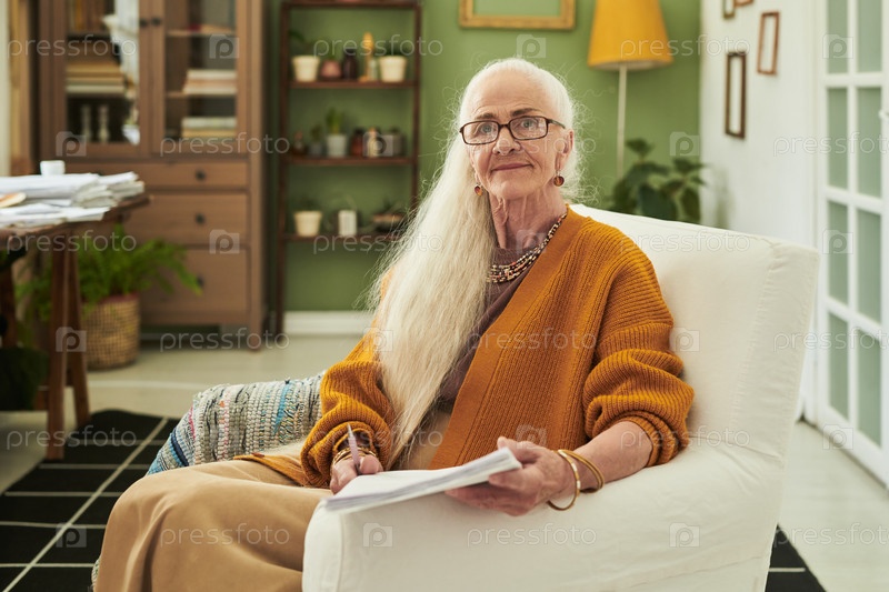 Портрет пожилой женщины, улыбающейся, сидящей в современном доме