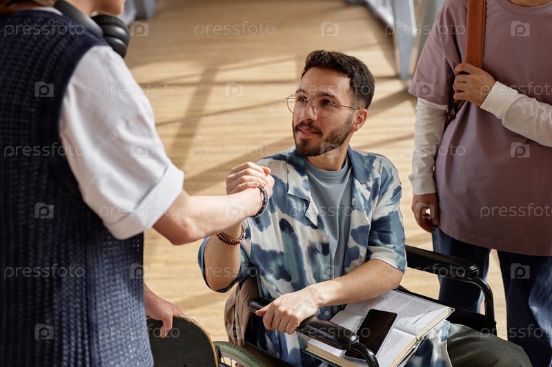 Улыбающийся парень с инвалидностью дает рукопожатие другому студенту