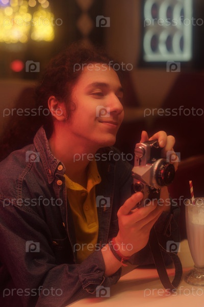 Улыбающийся молодой человек держит камеру во время момента расслабления