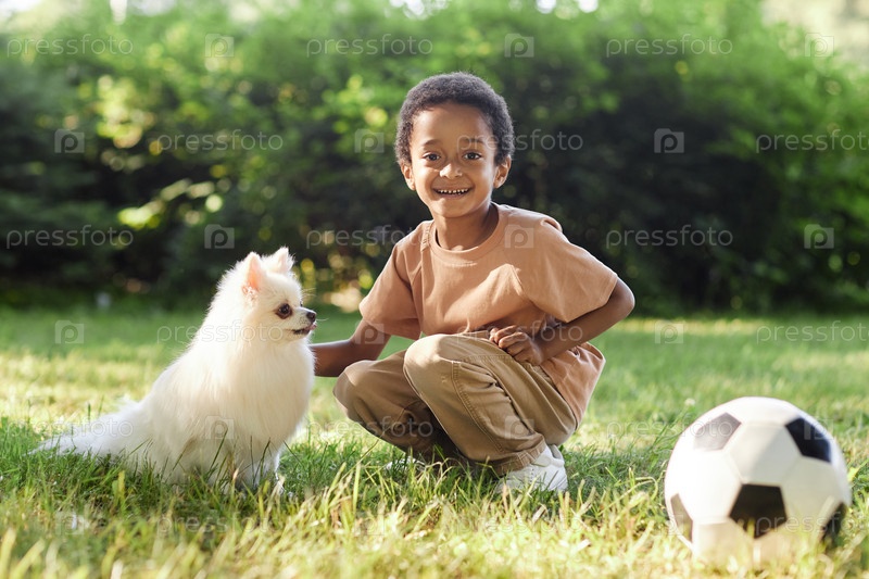 Счастливый мальчик ласкает собаку
