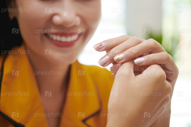 Улыбающаяся азиатская женщина с украшенными ногтями