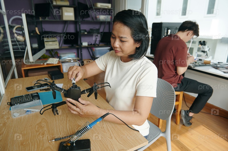 Женщина, ремонтирующая сломанный дрон в мастерской