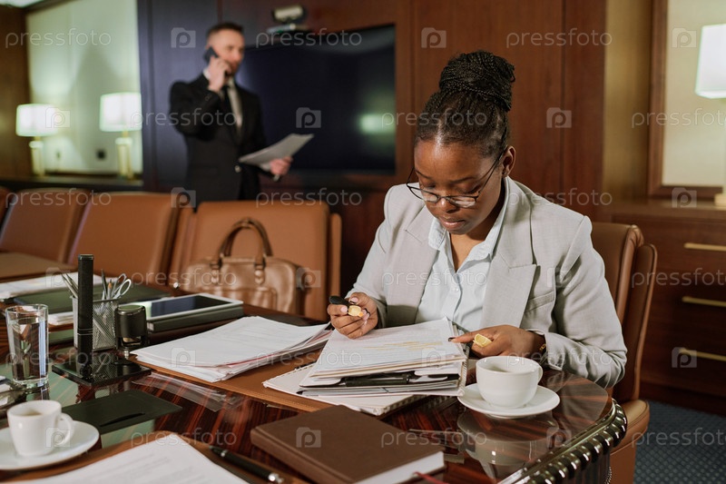 Чтение контракта за столом в зале заседаний