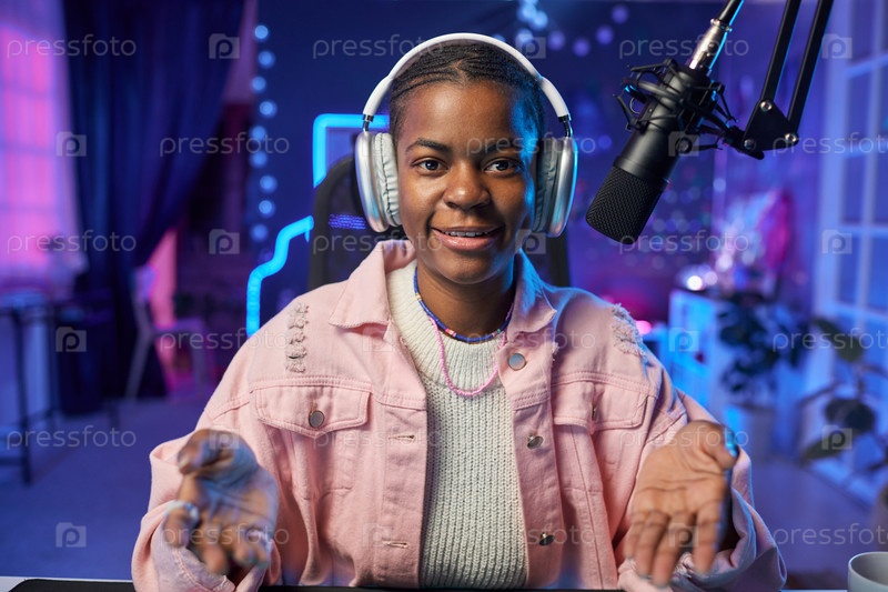 Влогер-девушка, говорящая с микрофоном