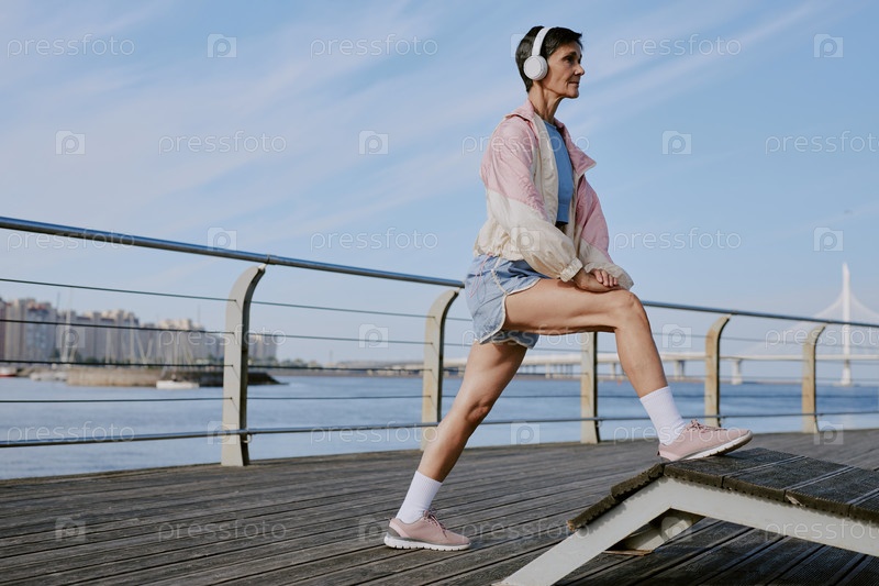 Старшая женщина растягивается на набережной