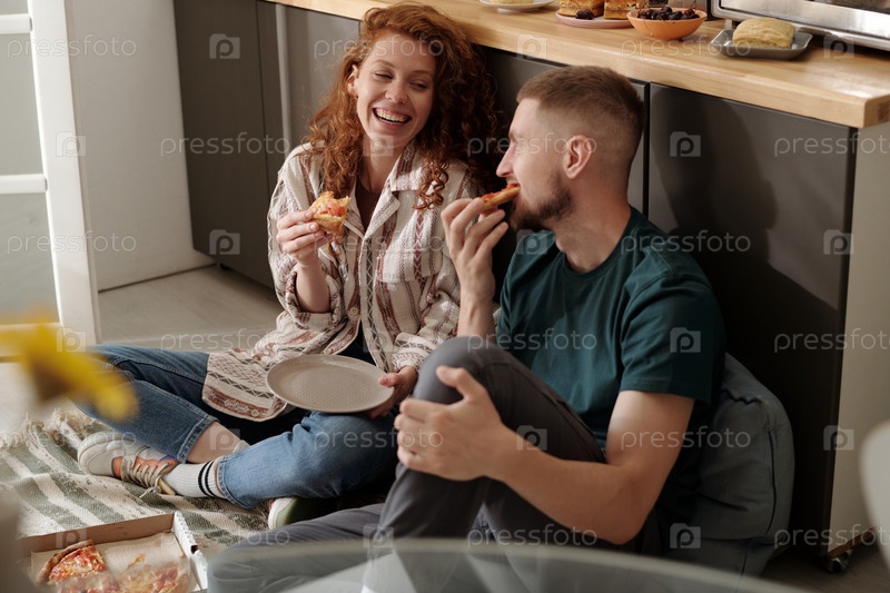 Пара ест пиццу у кухонного стола