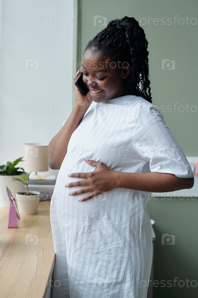 Улыбающаяся беременная женщина разговаривает по телефону, стоящая возле окна