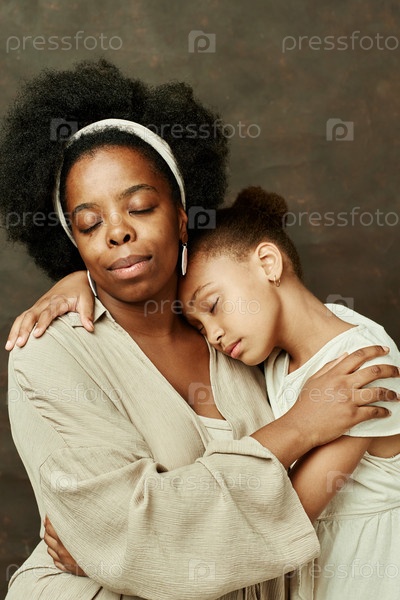 Портрет чернокожей матери и дочери, обнимающиеся на коричневом фоне