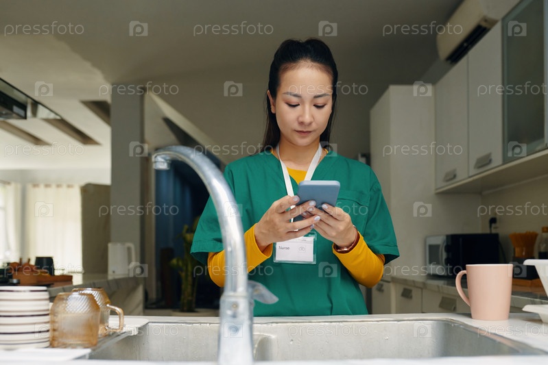 Женщина, которая носит скраб и читает со своего мобильного телефона на кухне