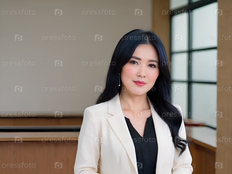 Портрет улыбающейся азиатской женщины в белом блейзере на работе