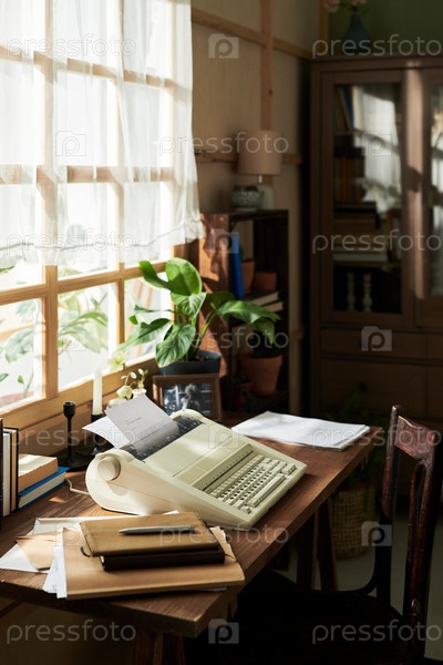 Стол с ретро-компьютером и бумагами в уютном рабочем пространстве