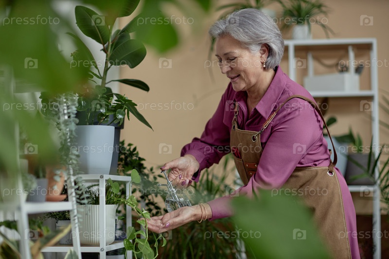 Улыбающаяся взрослая женщина заботится о растениях