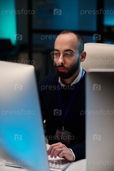 Бородатый человек использует компьютер с голубыми огнями
